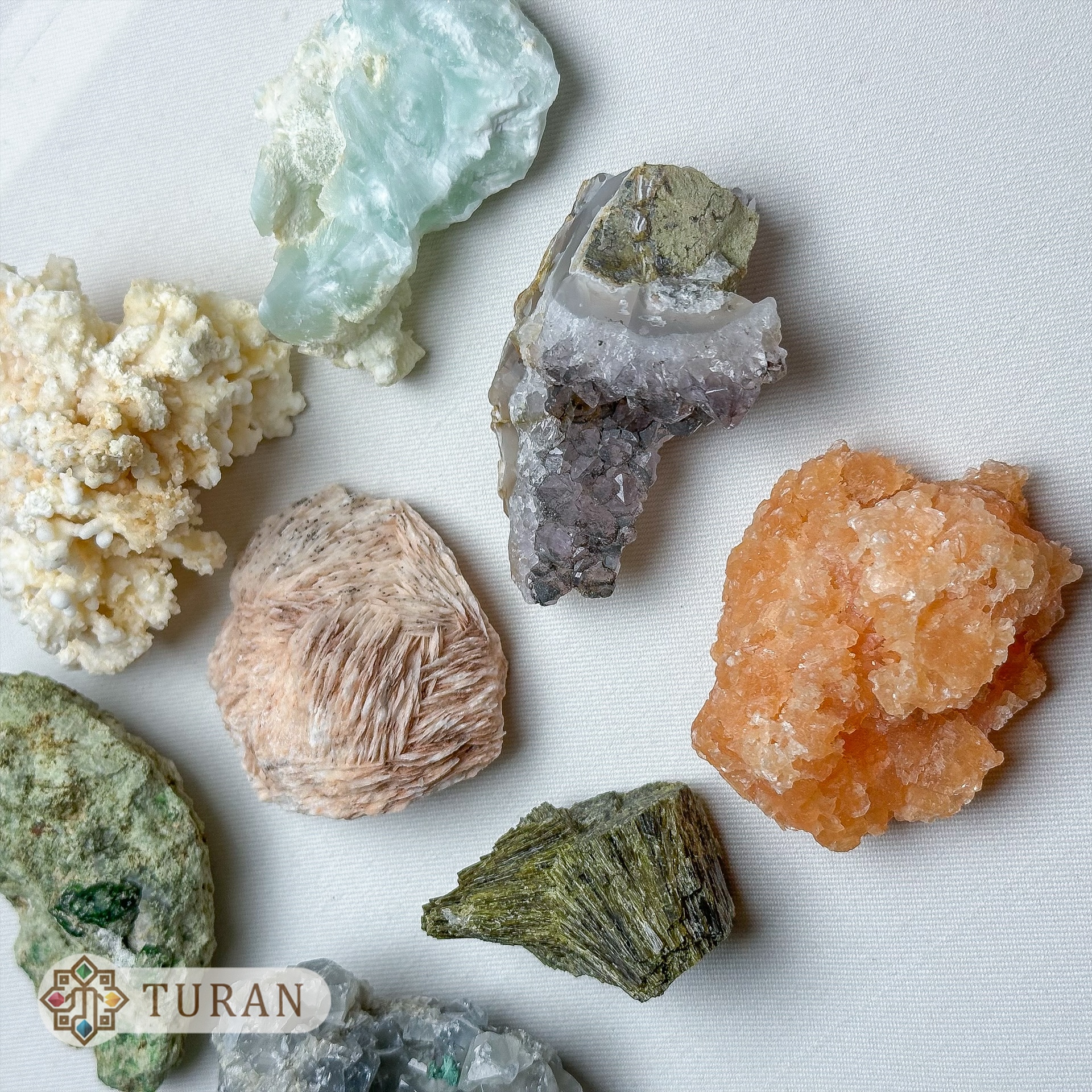 مدلگارنت.اپیدوت دم جاوریی.سلستین.ژیپس نارنجی.آراگونیت.آراگونیت آبی.باریت.آمیتیست