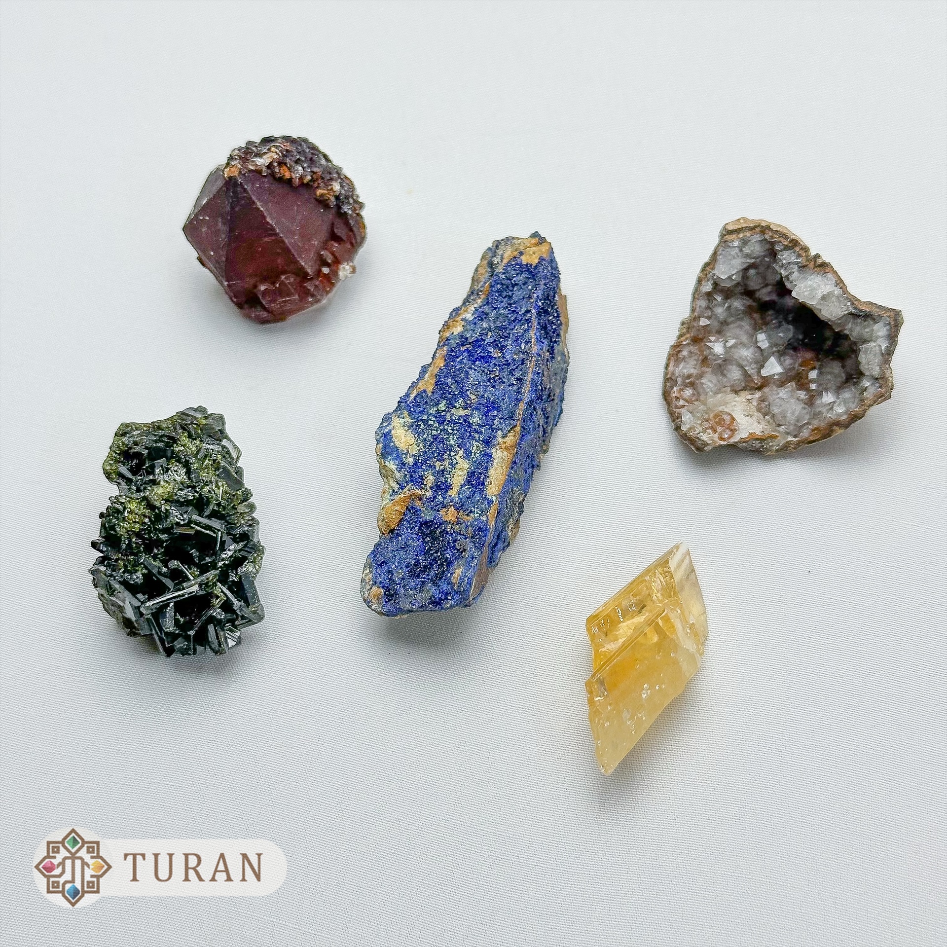 مدل: کلسیت طلایی-آزوریت-اپیدوت-کوارتز هماتوئیدی ژئود کوارتز