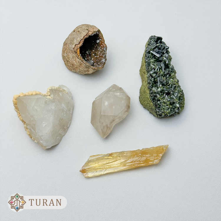 مدل: ژئود کوارتز-کلسیت طلایی-بلور کوارتز-اپیدوت-کوارتز هرکیمر