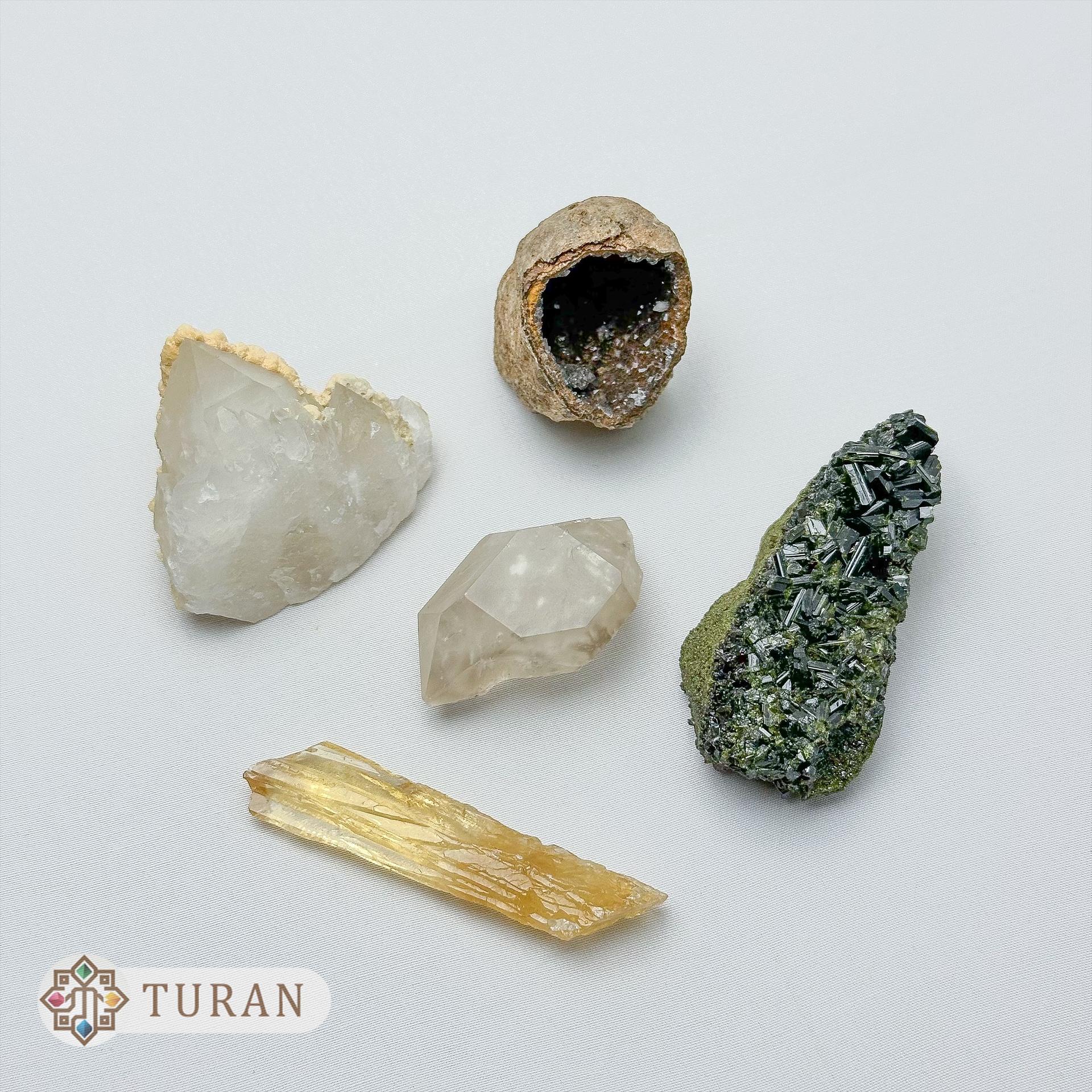 مدل: ژئود کوارتز-کلسیت طلایی-بلور کوارتز-اپیدوت-کوارتز هرکیمر