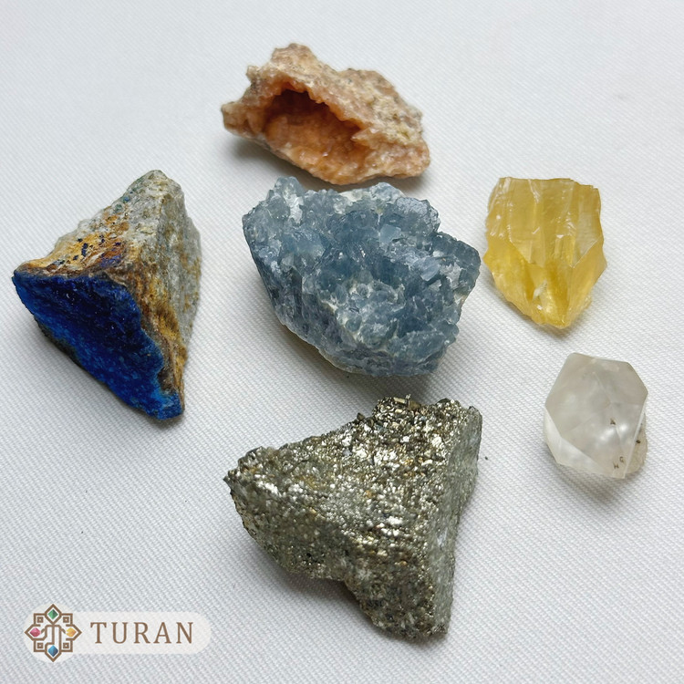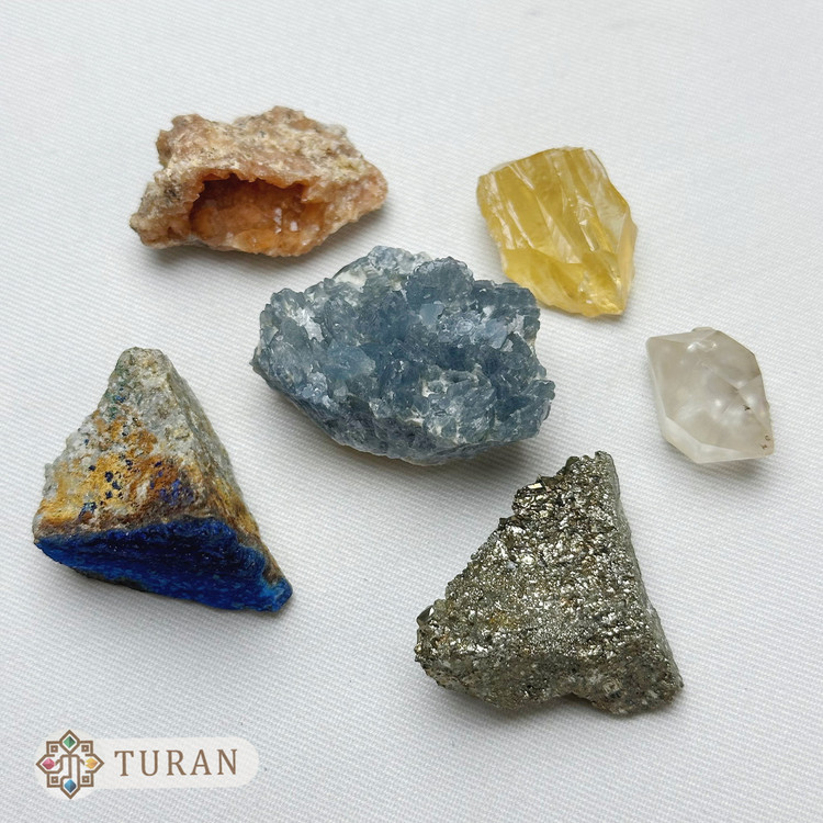 مدلسلستین نارنجی-سلستین ابی-کلسیت طلایی-پیریت-ازوریت-کوارتز هرکیمر